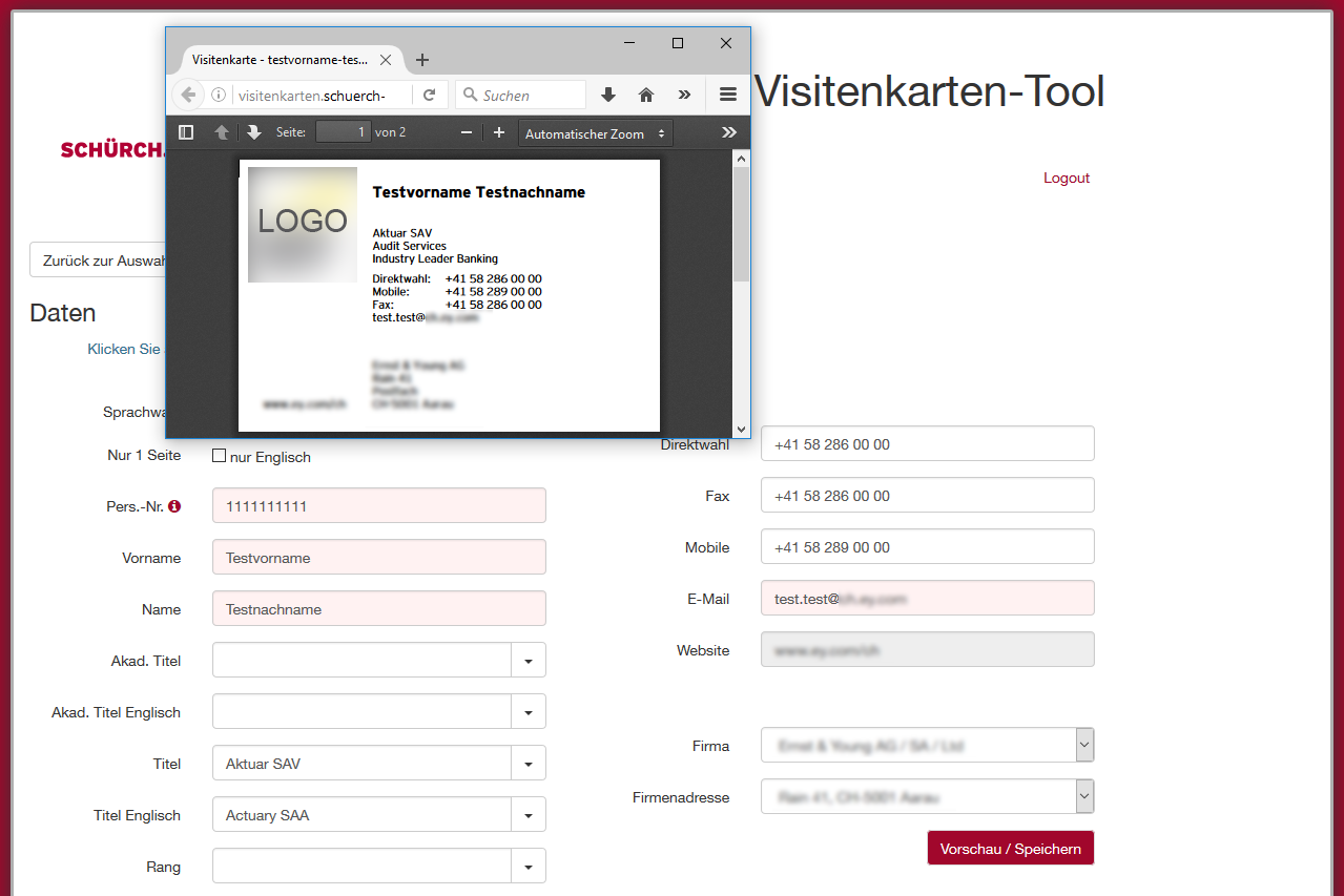 Visitenkarten-Tool für Grosskunden. Basierend auf Wordpress. Mitarbeiter- bzw. Visitenkartendaten können erfasst, bearbeitet und gelöscht werden. Eine PDF-Vorschau zeigt das fertige Produkt. Bei der Bestellung wird ein PDF generiert, das dann von der Druckerei direkt gedruckt werden kann.
